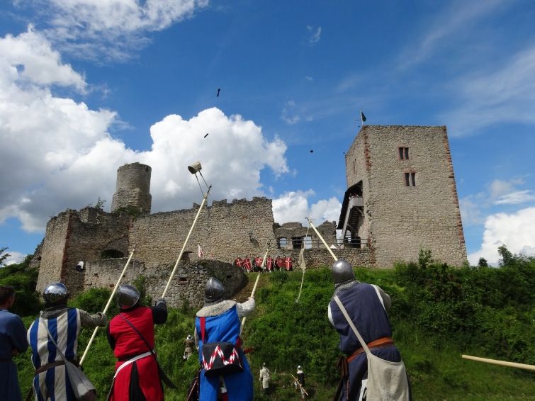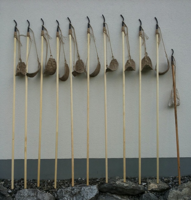 Hier zu sehen sind rekonstruierte Stockschleuder, Stabschleuder oder Fustibal (lateinisch Fustibalus).