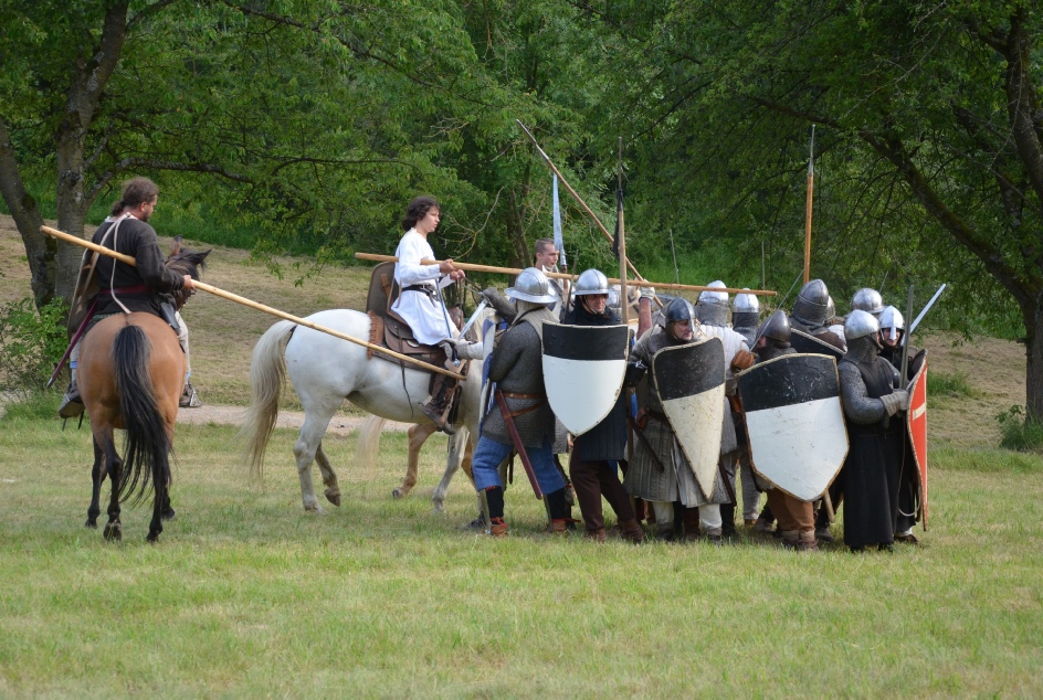 Der Reiter drückt mit seinem Pferd gegen die Fußsoldaten die sich mit ihren Schilden schützen.